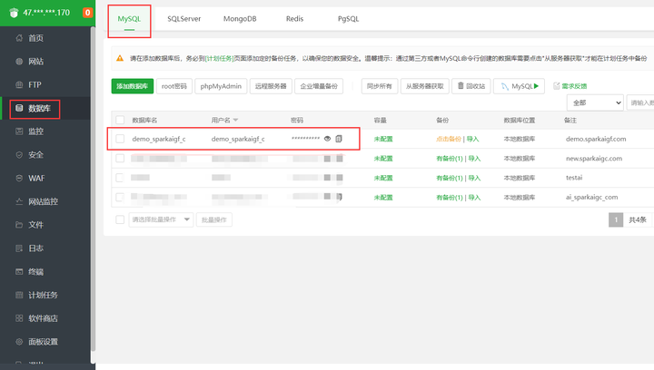 其中mysql为必配项目、redis服务必须安装 否则无法启动项目 jwt token 必须修改为自己个人的密钥(再原有基础上再加一点随机英文即可) 宝塔数据库信息可按下图直接查看