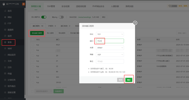 宝塔面板安全开启9520端口(如果在配置文件自定义了其他端口,开启对应端口即可,不要和系统一些端口冲突,建议默认9520端口)
