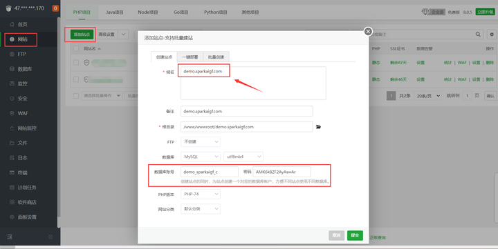 添加站点 9520 端口,宝塔安全需要开启该端口,不然无法访问