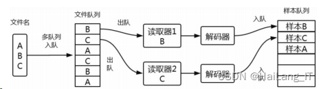 根据不同的设置,或者拷贝第二阶段的样本,使其相 互独立,因此可以从多个文件中并行读取。在第二阶段排 队操作,即入队到队列中去,在下一阶段出队。因为将开 始运行这些入队操作的线程,所以训练循环会使样本队列 中的样本不断出队,如图所示。