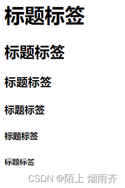 <!DOCTYPE html><html lang="en"><head> <meta charset="UTF-8"> <meta http-equiv="X-UA-Compatible" content="IE=edge"> <meta name="viewport" content="width=device-width, initial-scale=1.0"> <title>Document</title></head><body> <h1>标题标签</h1> <h2>标题标签</h2> <h3>标题标签</h3> <h4>标题标签</h4> <h5>标题标签</h5> <h6>标题标签</h6></body></html>