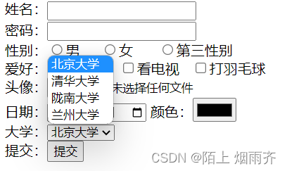 大学:<select> <!-- 下拉菜单标签--> <option>北京大学</option> <!-- 第一个就是默认选项--> <option>清华大学</option> <option>陇南大学</option> <option>兰州大学</option> </select> <br>