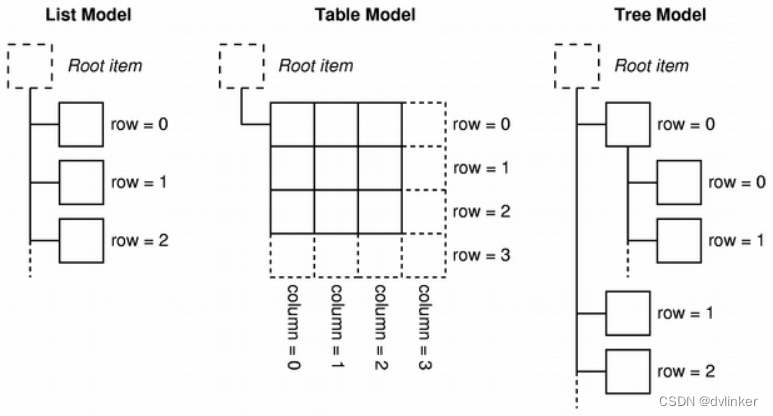List Model虽然是线性的列表,有一个 Root Item(根节点),线性的一个个数据可以看作是一个只有一列的表格,但是它是有层次的,因为有一个根节点。Table Model就比较容易理解,只是也存在一个根节点。Tree Model主要面向层次数据,而每一层次都可以都很多列,因此也是一个带有层次的表格。