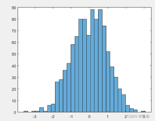 生成 1,000 个随机数并创建直方图。将条柱边指定为在直方图边上具有宽条柱的向量,以捕获不满足条件的异常值∣x∣<2.第一个向量元素是第一个条柱的左边缘,最后一个向量元素是最后一个条柱的右边缘。
