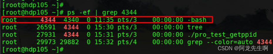多次执行我们发现程序多次执行子进程每次都会创建新的新的进程标识符,父进程标识符没有改变。如下父进程是bash命令行解释器。