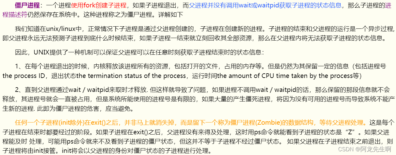 1.僵死状态(Zombies)是一个比较特殊的状态。当子进程退出并且父进程(使用wait()系统调用)没有读取到子进程退出的返回代码时就会产生僵死(尸)进程