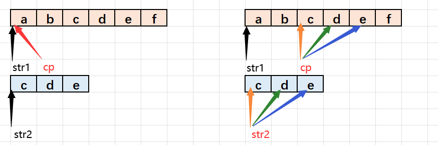 为进一步确认, c p cp cp 与 s t r 2 str2 str2 同时遍历后面的字符,每遍历一次,相比较一次。当 s t r 2 str2 str2 遍历完字符串,比较结束,发现所比较的字符全部相等,即找到 s t r 1 str1 str1 中的 s t r 2 str2 str2。