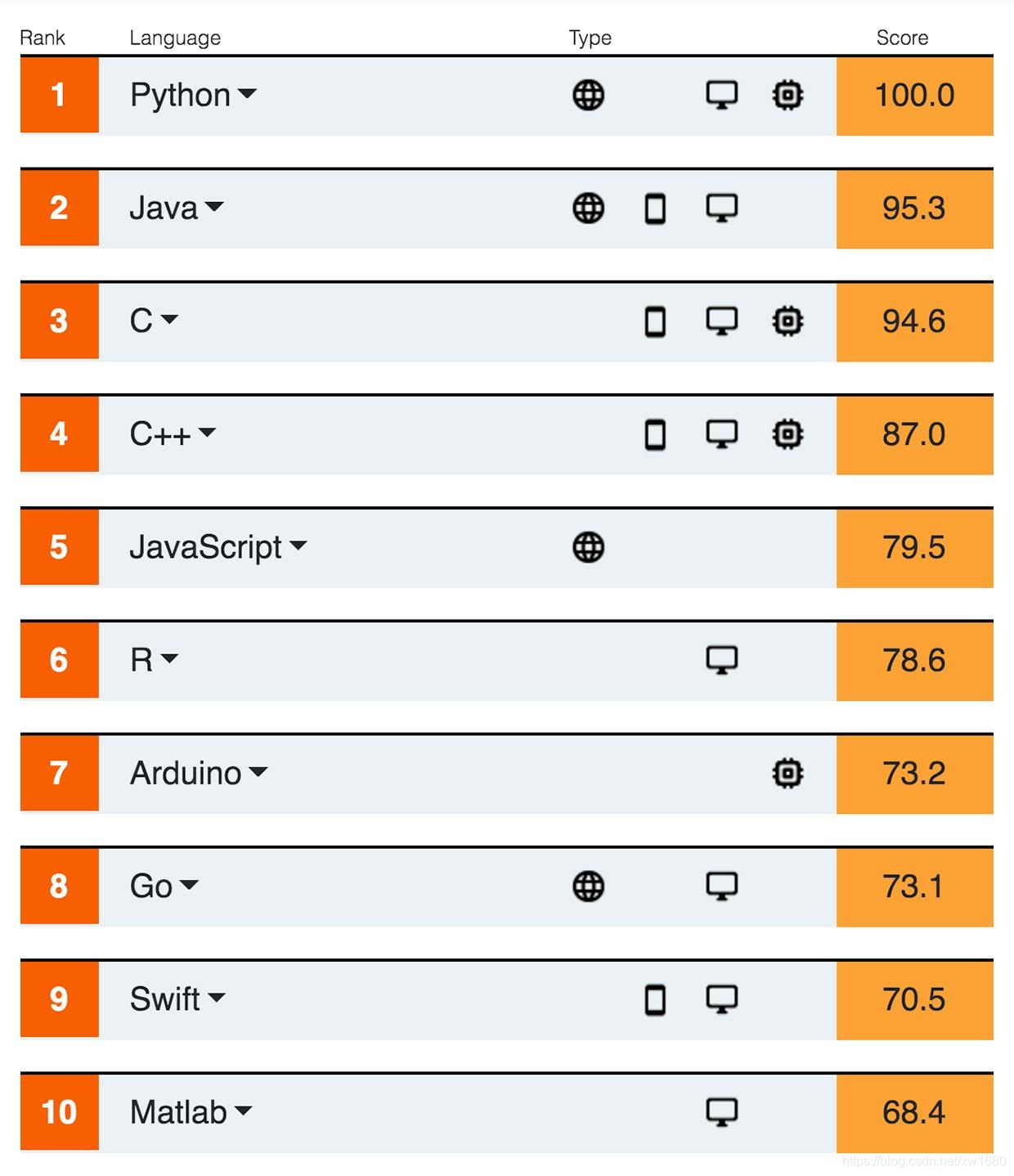 1991年,Python 的第一个公开发行版问世。从 2004 年开始,Python 的使用率呈线性增长,逐渐受到编程者的欢迎和喜爱。2010 年,Python 荣膺 TIOBE 2010 年度语言桂冠;2017-2020 年,在 IEEE Spectrum 发布的年度编程语言排行榜中,Python 已经夺得四连霸。IEEE Spectrum 发布的 2020 年度编程语言排行榜的前 10 名如图所示。