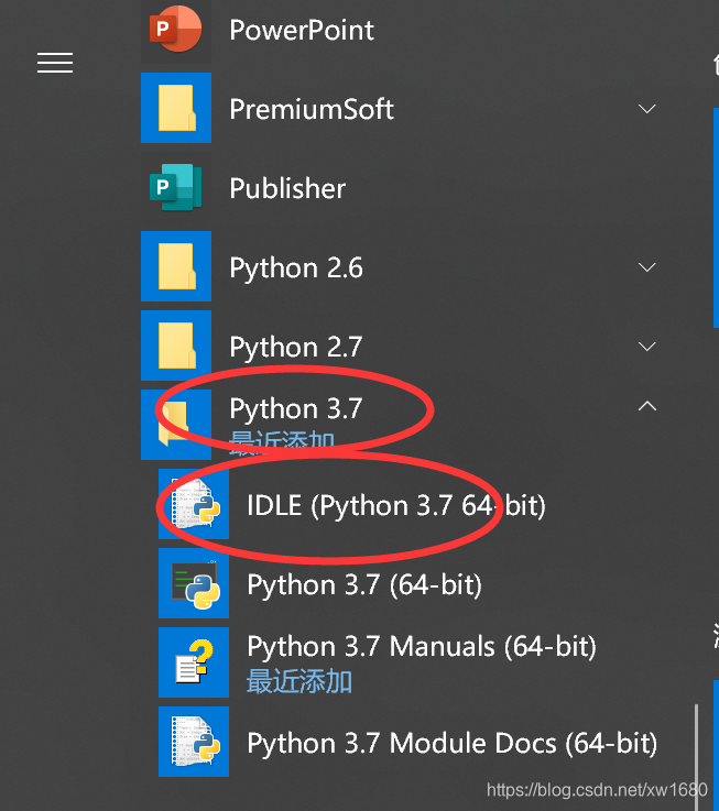 单击 Windows10 系统的开始菜单,然后依次选择所有程序 ==> Python 3.7 ⇒ IDLE(Python 3.7 64-bit) 菜单项。