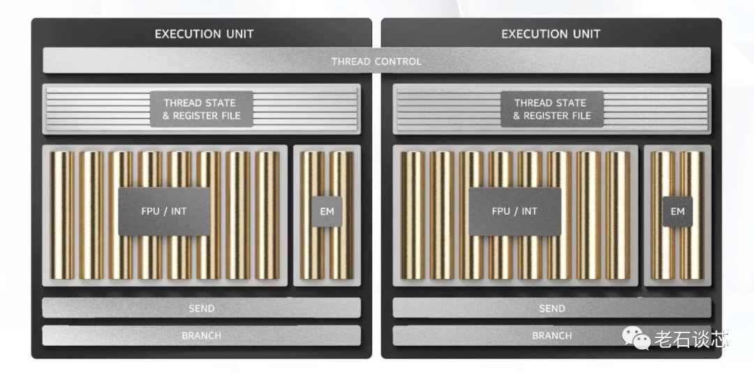 在英特尔的第11代集显中,每个EU里包含8个用来进行算术运算的流水线。为了得到更高的算术运算性能,XeLP将EU里的算术运算流水线扩展了一倍,达到16条。这些算术运算流水线可以执行定点数、单精度浮点数和双精度浮点数运算,以及复杂数学运算和可选的矩阵运算的扩展。每条流水线的宽度都比上一代得到了增加,从而将INT16和INT32的性能提升了一倍。事实上,为了简化实现过程,XeLP将上一代集显的两个EU单元合并在一起,并共用一个线程管理模块。