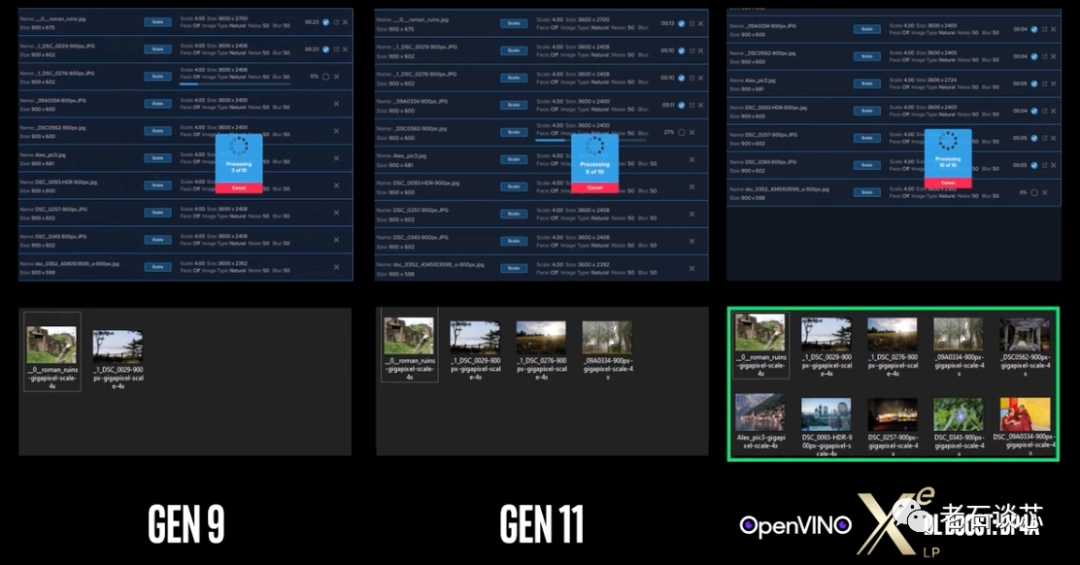 在英特尔最新的Tiger Lake架构中,包含了名为Willow Core的全新CPU内核单元,以及XeLP的集显版本。关于Tiger Lake和Willow Core的详细技术解读,将会在下篇文章里进行深入介绍。这里想提到的是,Tiger Lake里的XeLP还对AI运算进行了一定的架构优化。当结合OpenVINO工具包和英特尔的DL Boost技术时,就可以大幅提升AI推断的算力。如下图所示,当运行Gigapixel AI进行图像增强时,XeLP和前两代GPU相比取得了指数级的算力提升。