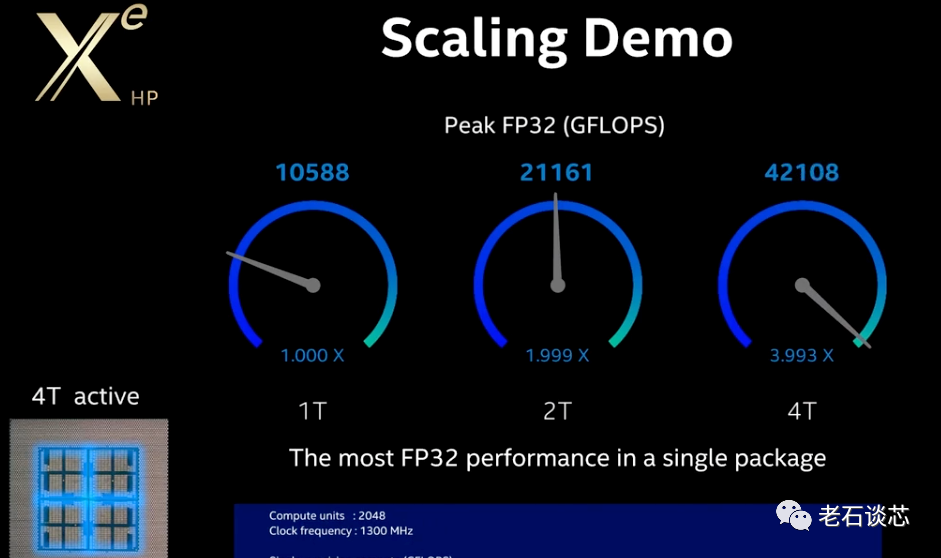 从下面的实验室测试实例可以看到,当增加Tile的数量时,芯片的FP32峰值算力从10TFLOPS,线性上升到21TFLOPS和42TFLOPS。