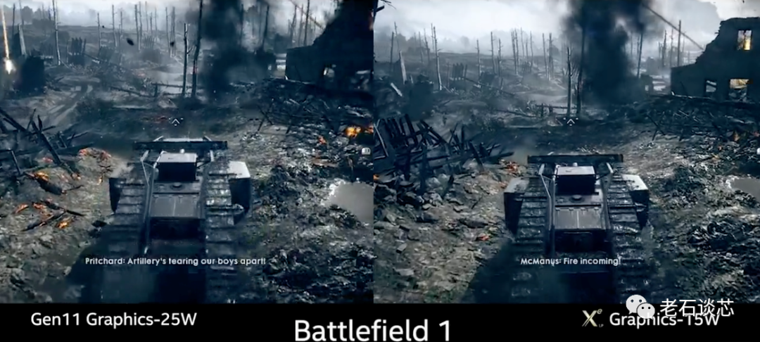 在具体的优化方面,首先就是在保持相同性能的前提下,大幅降低了功耗。例如,下图展示了在运行战地1的时候,英特尔前一代GPU和XeLP的画面和功耗对比。可以看到,在画质相似的情况下,前一代GPU的功耗为25瓦,而XeLP仅为15瓦。此外,XeLP还对帧率进行了提升,这也能很大程度上避免掉帧,使得画质表现更为细腻,在下图中坦克的履带部分也能较为明显的看出来。