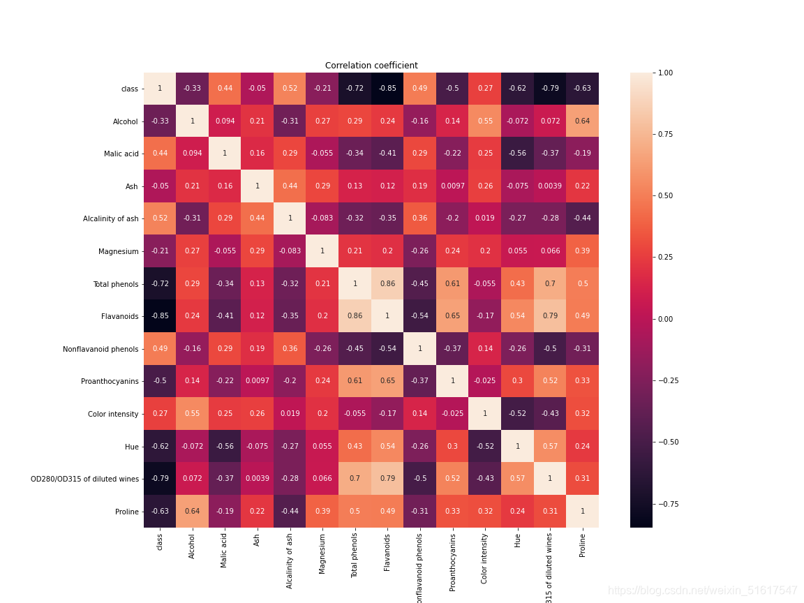 以sklearn库中的wine数据集(笔者使用时已将数据集导入到了csv文件中)为例,计算该数据集各变量(特征)之间的相关系数。