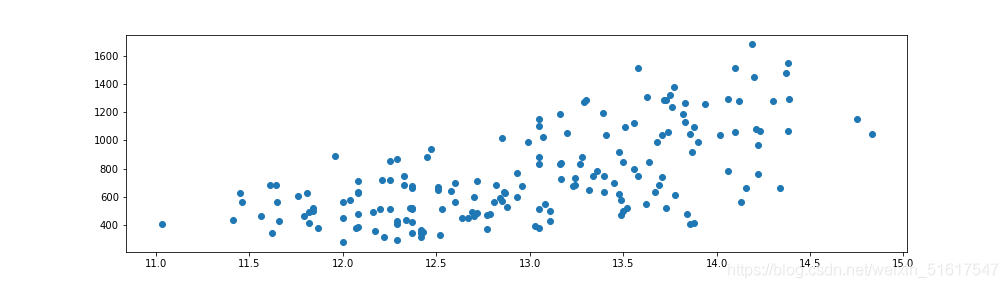 再以wine数据集中Alcohol与Proline两列为例绘出散点图。