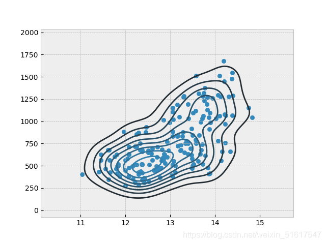 上图在散点图上绘制了一个等势线图(二维密度图),可视化了两个数值型变量之间的关系,等势线在本质上就是两个变量的地形图,每条等势线表示特定的密度值,并随着接近“顶峰”而增大。