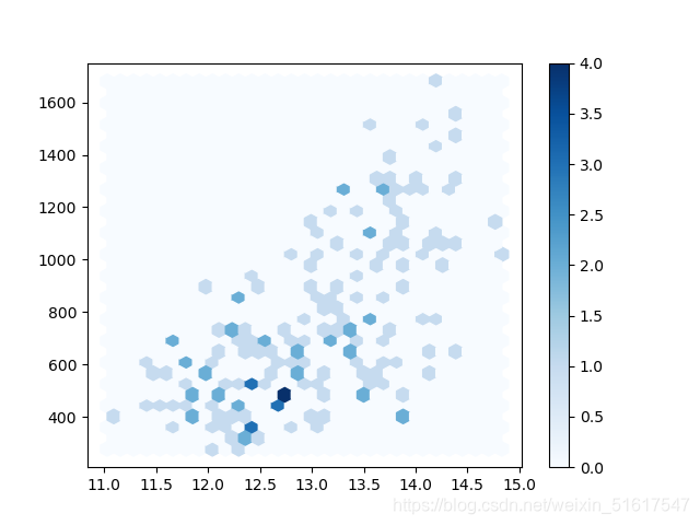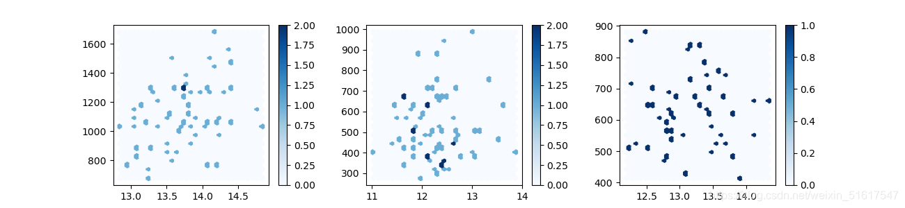 六边形图绘制的并非数据点,而是将记录(样本)分组为六边形的组距,并用不同的颜色绘制各个六边形,以显示每组中的记录数。
