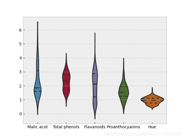 小提琴图是箱形图的一种增强表示,它以y轴为密度来绘制密度估计量的情况。绘图中对密度做镜像并反转(即核密度函数),并填充所生成的形状,由此生成了一个类似小提琴的图形。