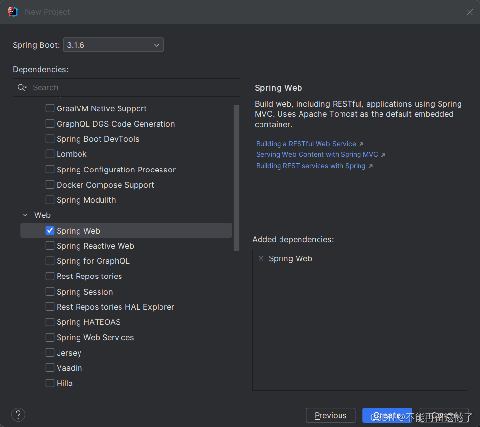 在前面我们创建 Spring Boot 项目的时候,勾选的 Spring Web 框架其实就是 Spring MVC 框架。