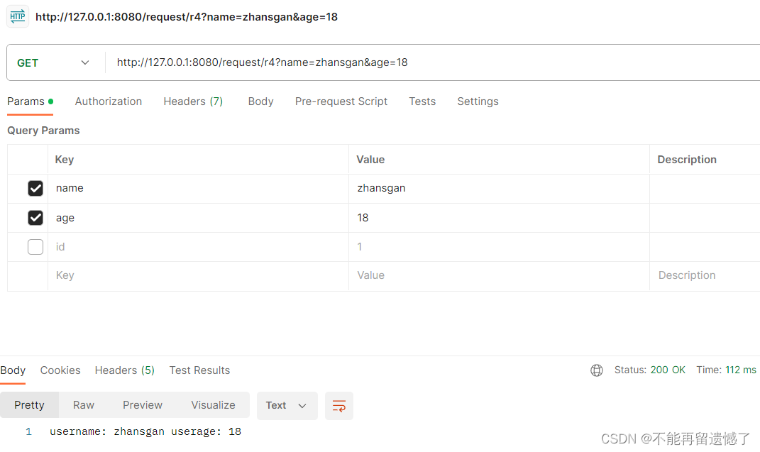 @RequestMapping("/r4")public String r4(@RequestParam("name") String username, @RequestParam(value = "age", required = false) Integer userage) { return "username: " + username + " userage: " + userage;}