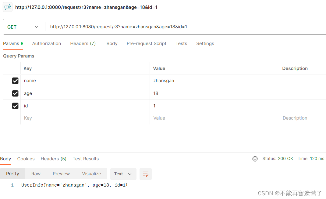package com.example.springmvcdemo2;public class UserInfo { private String name; private Integer age; private Integer id; public String getName() { return name; } public void setName(String name) { this.name = name; } public Integer getAge() { return age; } public void setAge(Integer age) { this.age = age; } public Integer getId() { return id; } public void setId(Integer id) { this.id = id; } @Override public String toString() { return "UserInfo{" + "name='" + name + '\'' + ", age=" + age + ", id=" + id + '}'; }} @RequestMapping("/r3")public String r3(UserInfo user) { return user.toString();}