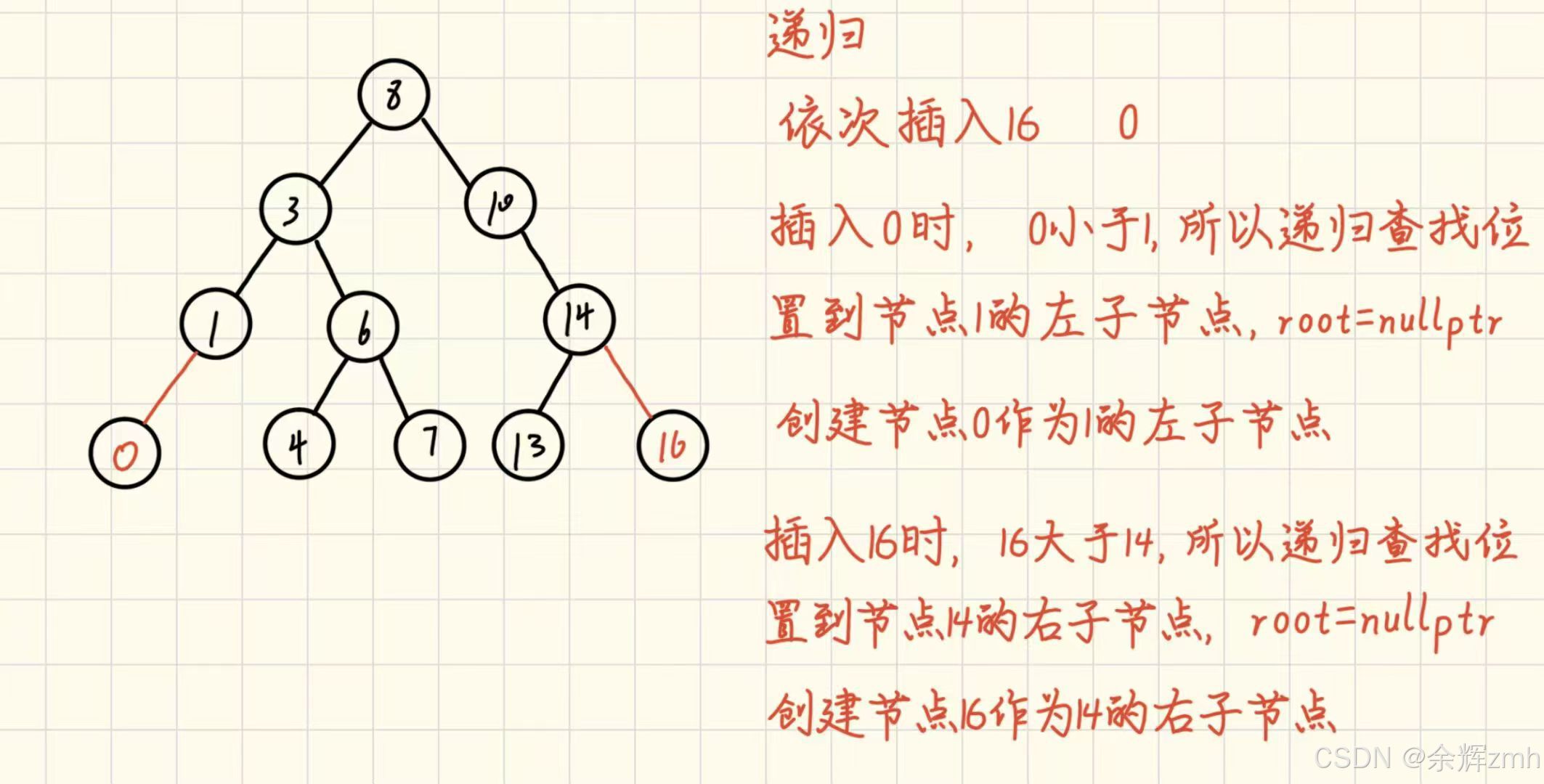 非递归代码实现:bool Insert(const K& key){ if(_root==nullptr){ _root=new Node(key); return true; } else{ Node* cur=_root; Node* parent=cur; while(cur){ if(cur->_key<key){ parent=cur; cur=cur->_right; } else if(cur->_key>key){ parent-cur; cur=cur->_left; } else{ return false; } } cur=new Node(key); if(parent->_key<key){ parent->_right=cur; } else{ parent->_left=cur; } } return true;} 实现原理: