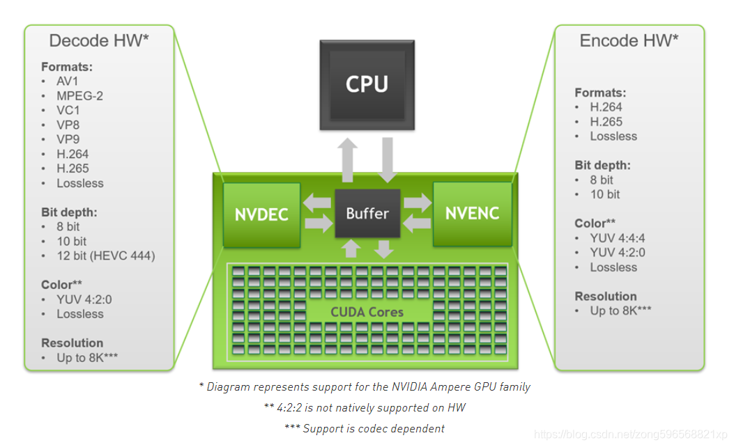 对于 NVIDIA 的 GPU 来说,都代用硬件编解码的芯片,可以支持各种格式的视频编解码及格式转换,具体地,解码使用 NVDEC 芯片,编码使用 NVENC 芯片。从官网图中,我们可以看到,编解码芯片已经覆盖到我们常见的的视频格式。