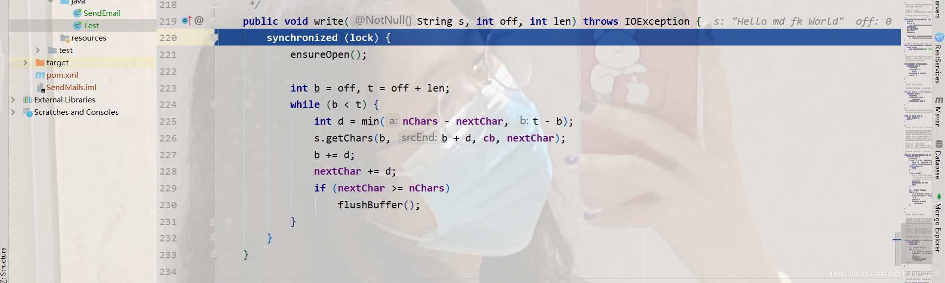这个时候我们进入了print方法。这里也很好理解。你可以想想当我们的字符串为null的时候,你会发现输出的是一个字符串的null,而在源码里面正好就是这样的设计。紧接着,将会调用该类中的write方法。那行,我们继续进入write方法。
