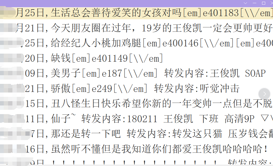 我成功的把班花空间的数据爬取下来了,主要还是说说的内容,通过她的说说我竟然发现了她喜欢王俊凯,而且还是铁粉的那种,这下我室友是没戏了,哎可怜的娃儿...