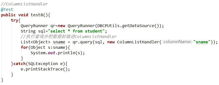 new ColumnListHandler(String columnName)把查询到的数据(可以有很多条数据)的某一个字段封装到List集合中,具体是哪一个字段要根据传入的参数columnName来决定。是没有ColumnHandler的;只有ColumnListHandler