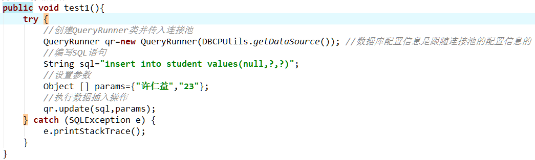 new QueryRunner(DataSource ds);数据库配置信息是根据传入的连接池的配置信息而来的。 - 方法: