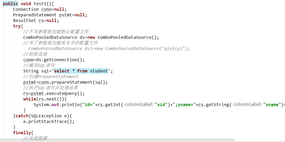配置文件中有两个配置,一个是默认配置(default-config),另一个是有名字的配置(named-config)。这两者的区别在于,当创建ComboPooledDataSource时,如果不传参数,那么就加载默认的配置信息;如果传入参数(就是name=“qishiyi"中的"qishiyi”),那么就根据name来加载有名字的配置信息。 - 加载配置文件: