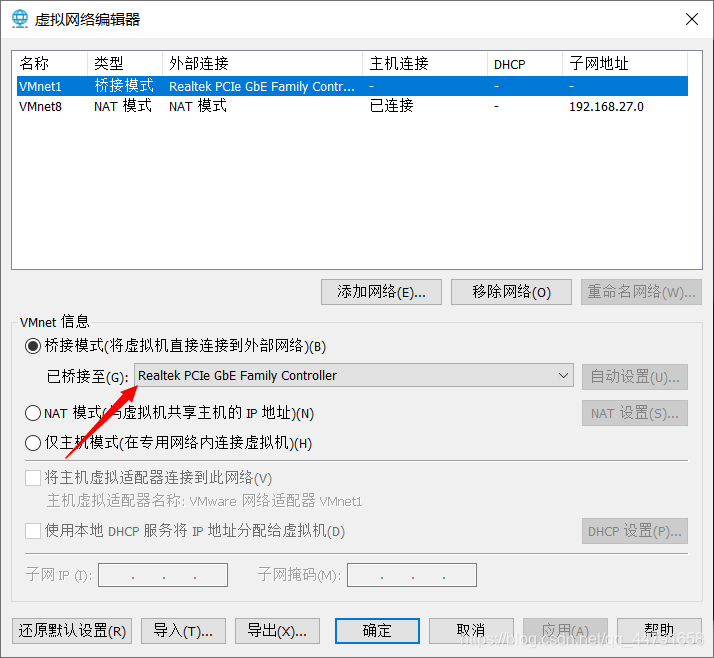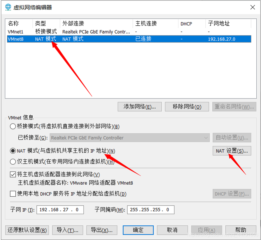 1、以管理员权限打开VMware Workstation软件,打开编辑菜单,打开虚拟网络编辑器,将VMnet1设置为桥接模式,并且选择已桥接至本机的网卡。将VMnet8设置为NAT模式,并打开NAT设置, 记下vmnet8的网关IP,后续设置静态IP需要。