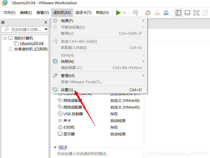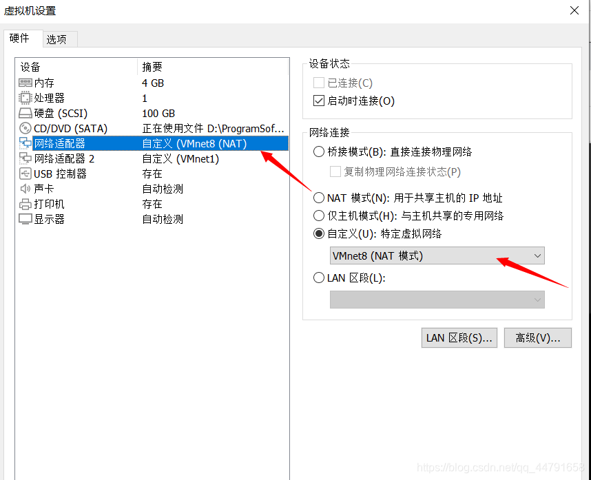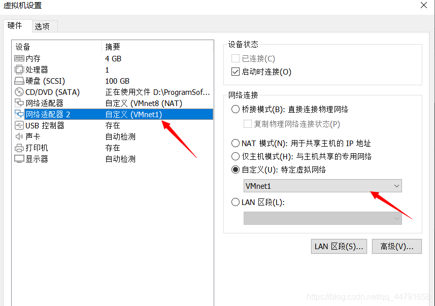 2、打开虚拟机下拉菜单的设置选项,增加一个网络适配器2。将网络适配器,网络适配器2的网络连接设置为自定义,在下拉框分别选择为VMnet8,与VMnet1。