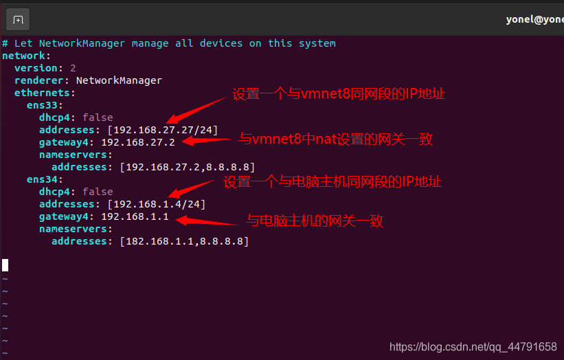 打开虚拟机的终端,输入sudo vi /etc/netplan/01-network-manager-all.yaml命令,输入密码,然后将文件内容修改为如下(注意缩进,缩进不对会导致配置失败)