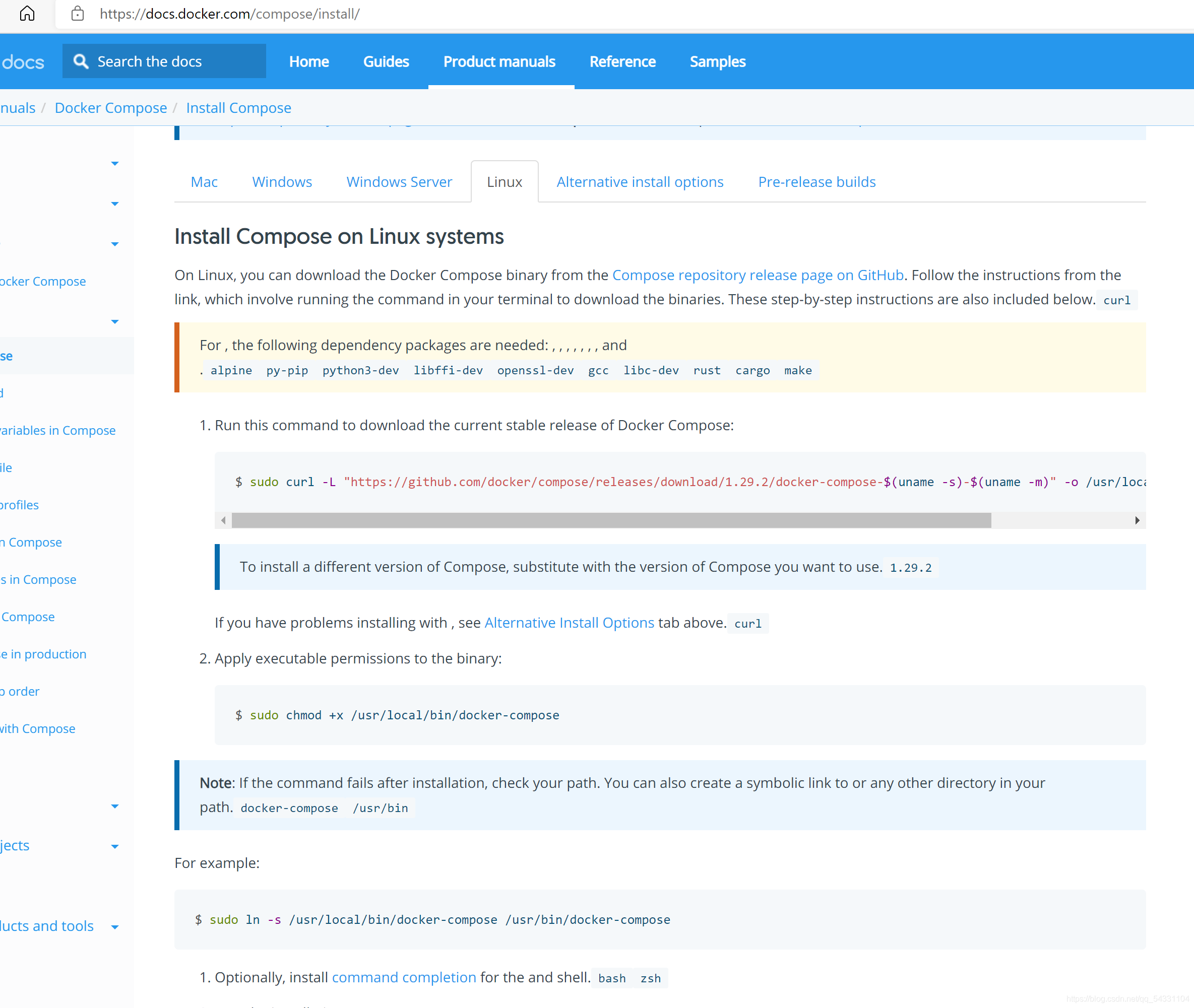 在docker-compose的官网找到linux的安装教程如下: