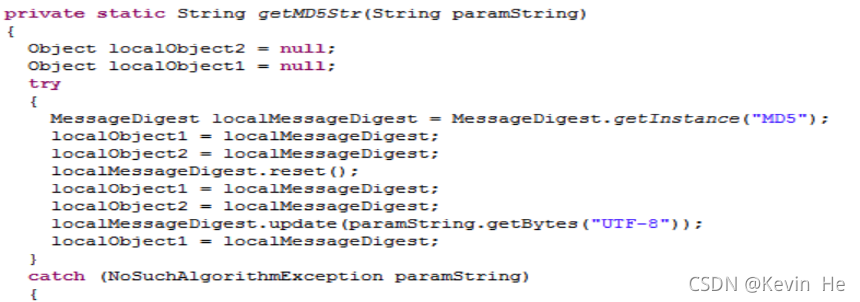 3. 将getMD5str()函数复制到IDEA中,去掉冗余代码,尝试对伪代码进行调试。传进一个字符串"kevin",输出"EBCD**3075"。至于getMD5str()函数的具体功能是什么,不是很重要,有兴趣的同学可以反编译后分析下。