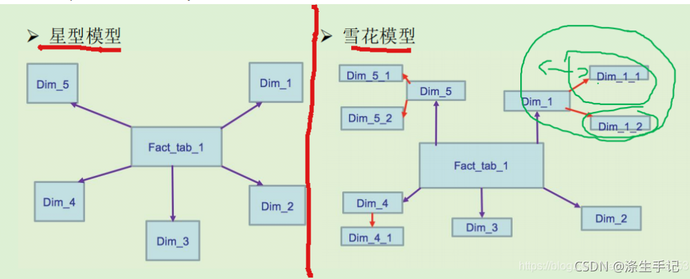 - 维度建模是面向分析的,为了提高查询性能可以增加数据冗余,反规范化的设计技术。