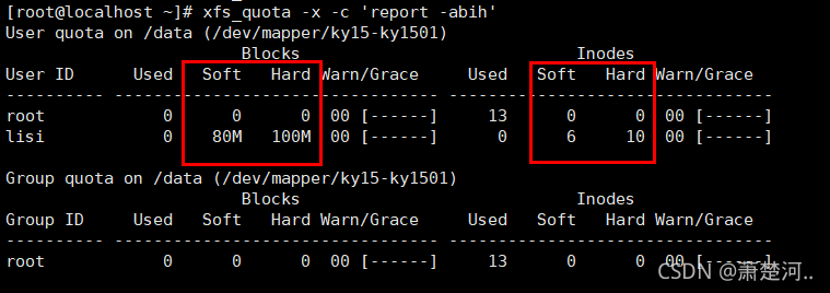 查看可用分区的磁盘容量配额使用情况:xfs_quota -x -c 'report -abih'
