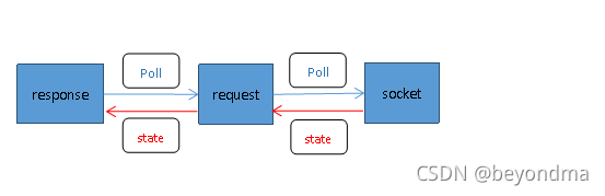 以上述情况为例,poll的方向是由response到request最后是socket,但是state和data的返回方向是完全返过来的,也就是说response通过poll来获取request的state,而request也同样通过poll来获取socket的state。