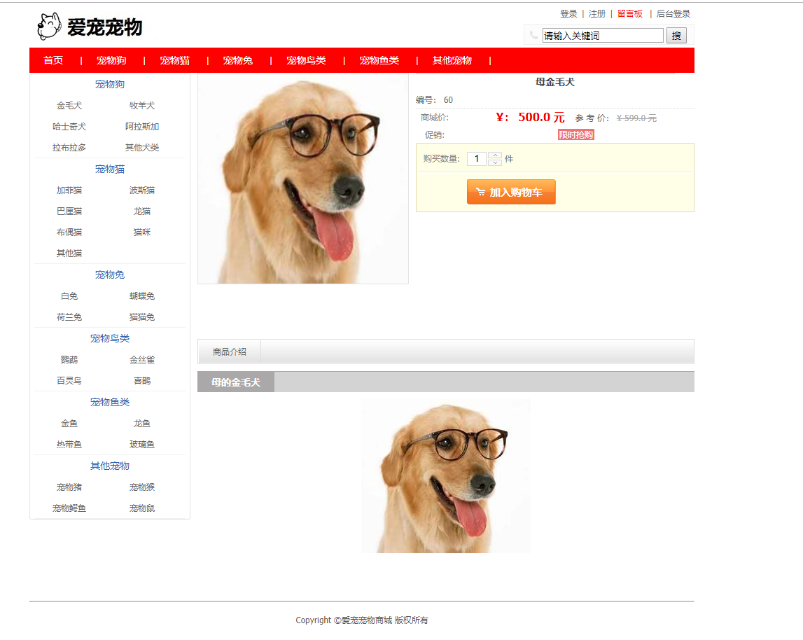 系统分为前端和后端,前端主要是展示不同类型的宠物,然后以不同类型进行展示,用户点击一个宠物之后可以查看宠物的详细信息,然后加入购物车,提交订单实现购买,当然用户还可以进行注册、登录、留言等功能。后端功能如下: