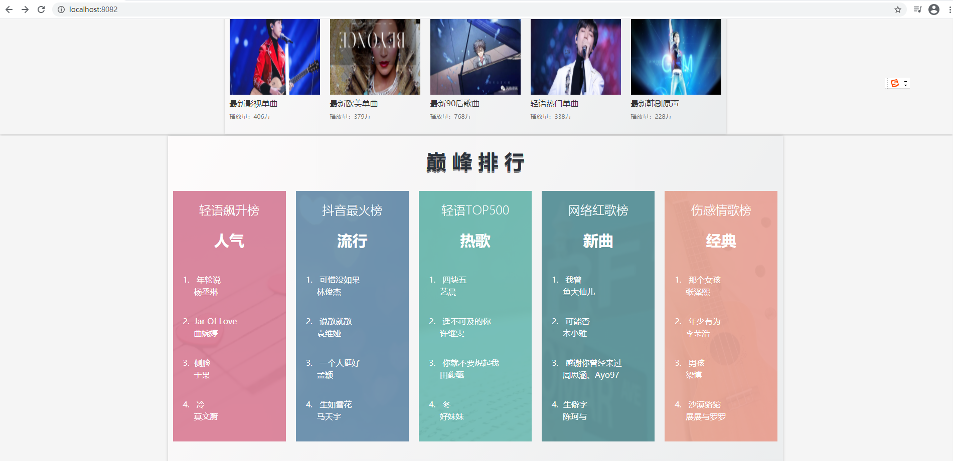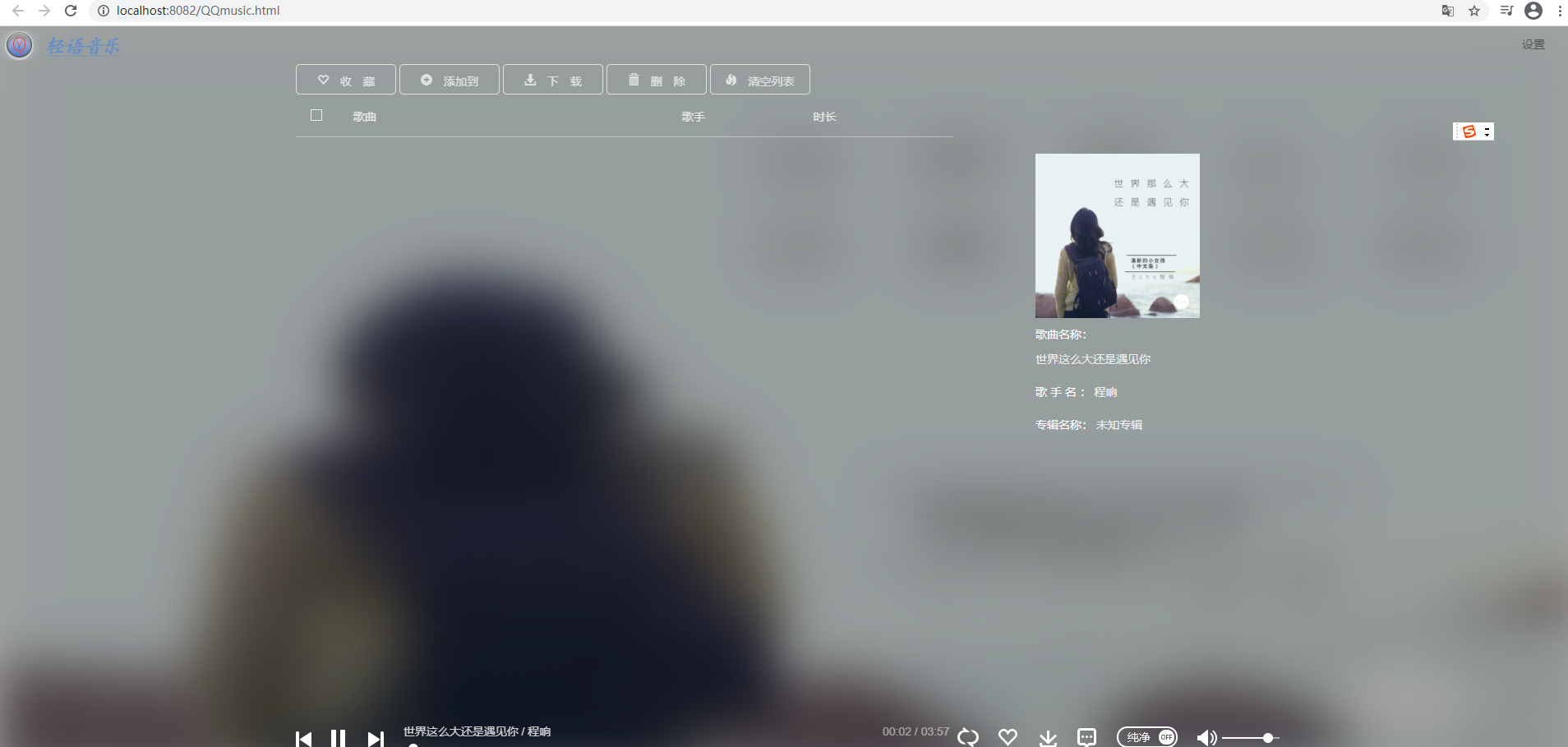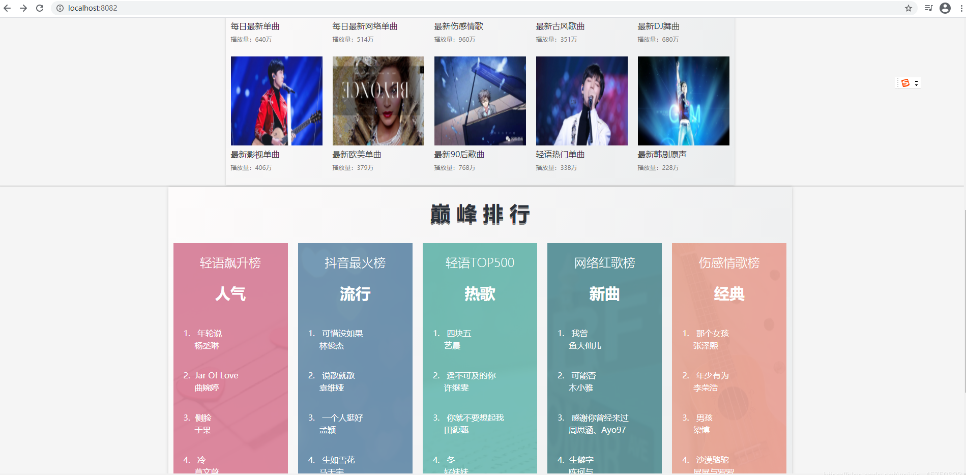 功能: 用户管理模块:用户登录、用户注册、修改密码 榜单列表模块:动态地从数据库中获取歌曲的链接和数据 在榜单中显示 歌曲搜索模块:在首页的搜索框中可以输入关键字进行歌 曲的模糊搜索 歌曲收藏模块:在榜单列表中或搜索页面中可以点击歌曲 进行收藏 我的音乐模块:收藏的歌曲会被添加到我的音乐列表中, 在我的音乐列表中也可以对歌曲进行删除操作 音乐播放器模块:在榜单、搜索页面和我的音乐列表等地 方点击歌曲可以炼专到播放页面进行播放。播放页面显示 播放进度条,删除歌曲,暂停等操作。播放页面背景为模 糊背景,根据歌手的专辑图片自动变化。