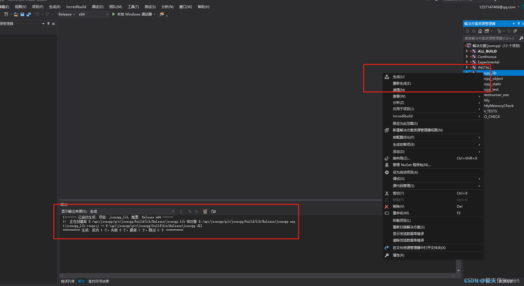 6)找到jsoncpp_lib,右键生成,下方出现lib和dll生成成功的提示,即可。lib在build/lib/Release/jsoncpp.lib;dll在build/bin/Release/jsoncpp.dll,将dll放置在C:\Windows\System32;include文件在为git文件夹下include。