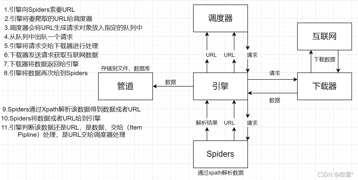 - 引擎:自动运行,无需关注,会自动组织所有的请求对象,分发给下载器。