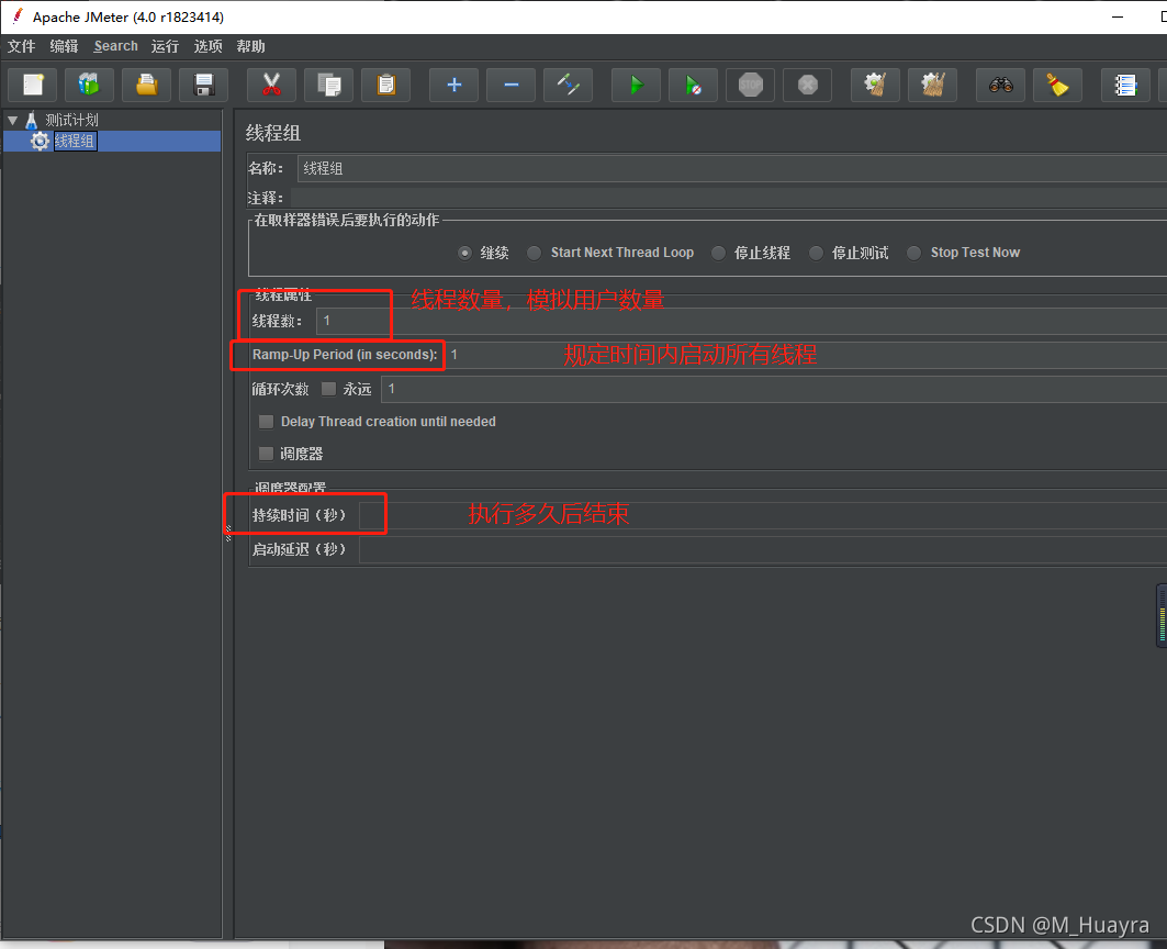线程数:虚拟用户数。一个虚拟用户占用一个线程。设置多少虚拟用户数在这里也就是设置多少个线程数。