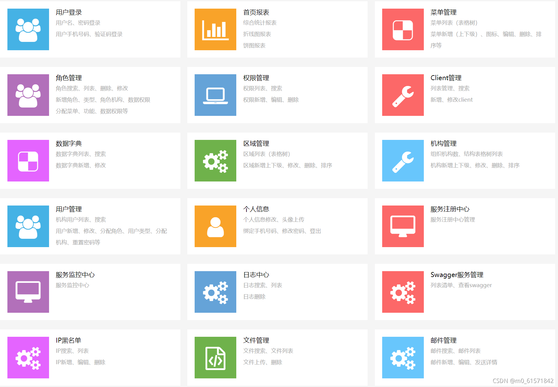 鸿鹄云架构【系统管理平台】使用J2EE技术来实施,是一个大型分布式的面向服务的JavaEE体系快速研发平台,基于模块化、服务化、原子化、热部署的设计思想,使用成熟领先的无商业限制的主流开源框架(Spring Cloud + Spring Boot + Mybatis + Oauth2 + Spring Security)构建。 采用服务化的组件开发模式,可实现复杂的业务功能。提供驱动式开发模式,整合内置的代码生成器,将JavaEE开发效率提高5倍以上,减少50%的代码开发量,解决80%的重复工作,让开发者更关注业务逻辑。使用Maven进行项目的构建管理,采用Jenkins进行持续集成,主要定位于大型分布式企业系统或大型分布式互联网产品的架构。