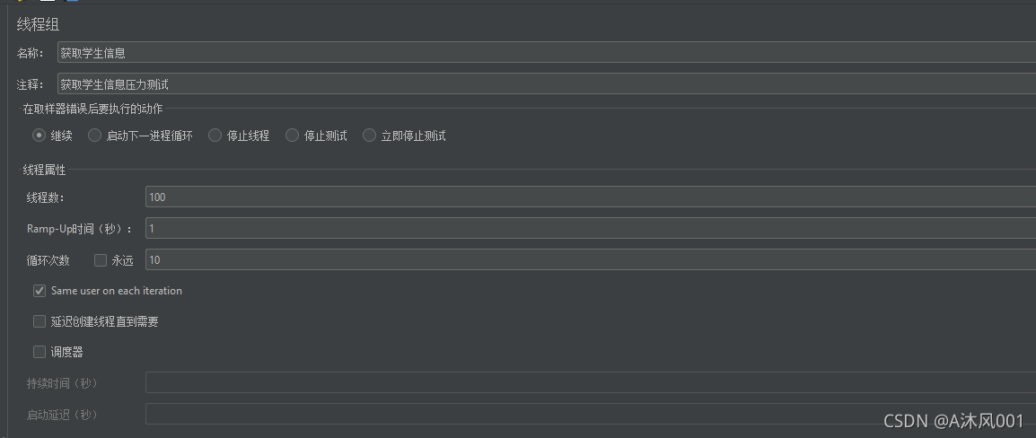 创建100个线程,指定在1s内生成这全部100个线程,循环跑10次,整个压测跑下来执行接口请求1000次。