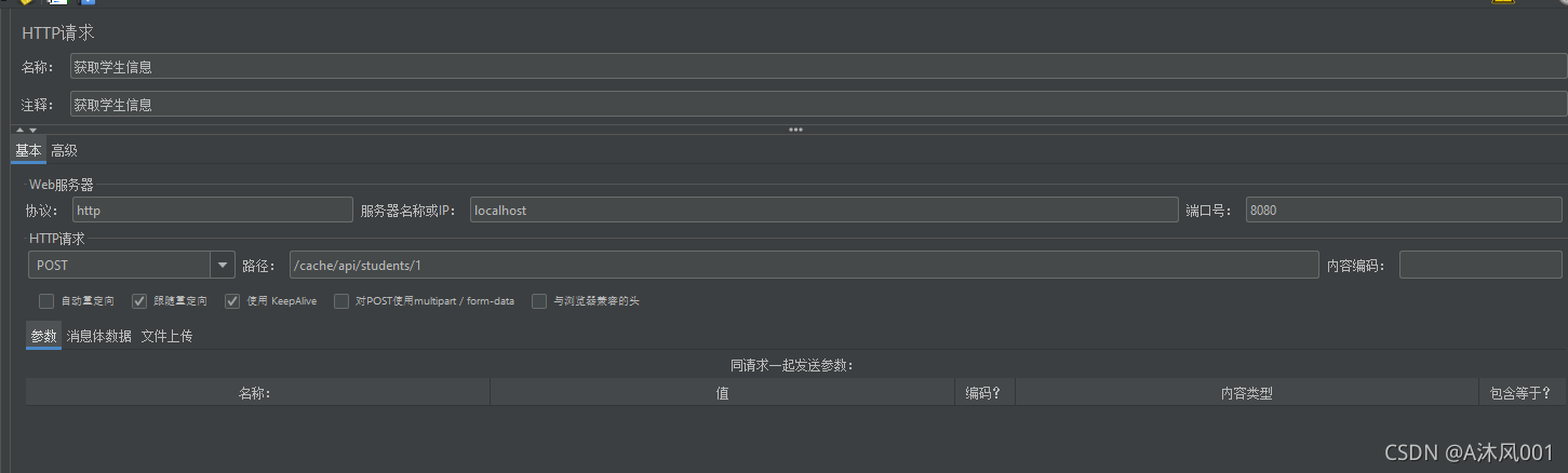 输入采样器的名称、协议、服务器域名或者IP、端口号、Method及Url信息。