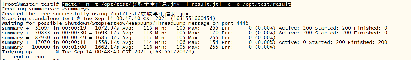 jmeter -n -t /opt/test/获取学生信息.jmx -r -l result.jtl -e -o /opt/test/result
