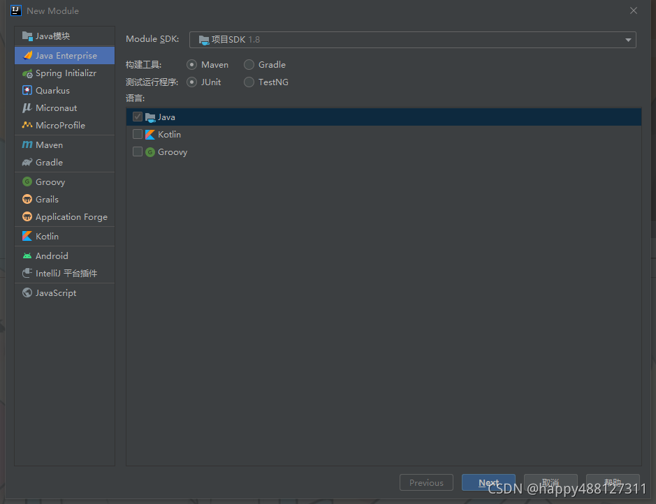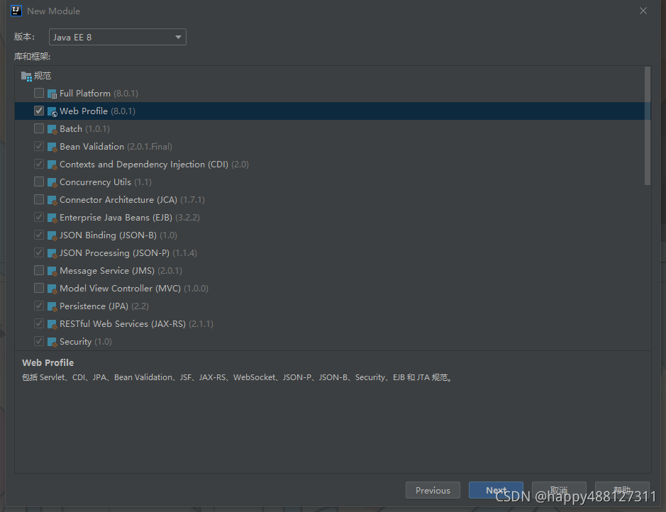 2.勾选 Web Profile,IDEA会自动帮你勾选其他所需要的框架(包括JSF),点击next